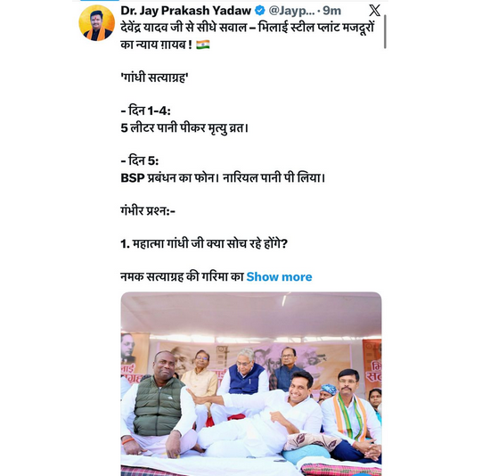 डॉ . जय प्रकाश यादव राष्ट्रीय युवा मोर्चा अध्यक्ष, भारतीय जनता मजदूर ट्रेड यूनियन काउंसिल (BJMTUC) ने देवेंद्र यादव की ‘सत्याग्रह नौटंकी’ पर भड़कते हुए X पर ऐसी खरी-खोटी सुनाई कि राजनीतिक पोल खुल गई। *”मजदूरों के साथ गलत हो रहा है! उनकी पीड़ा-वेदना को कौन सुनेगा? 2 बार महापौर, विधायक बने, किस मजदूर के आंसू पोंछे?”* – जय प्रकाश यादव जी ने सीधा सवाल दागा। जनता भी यही पूछ रही है!