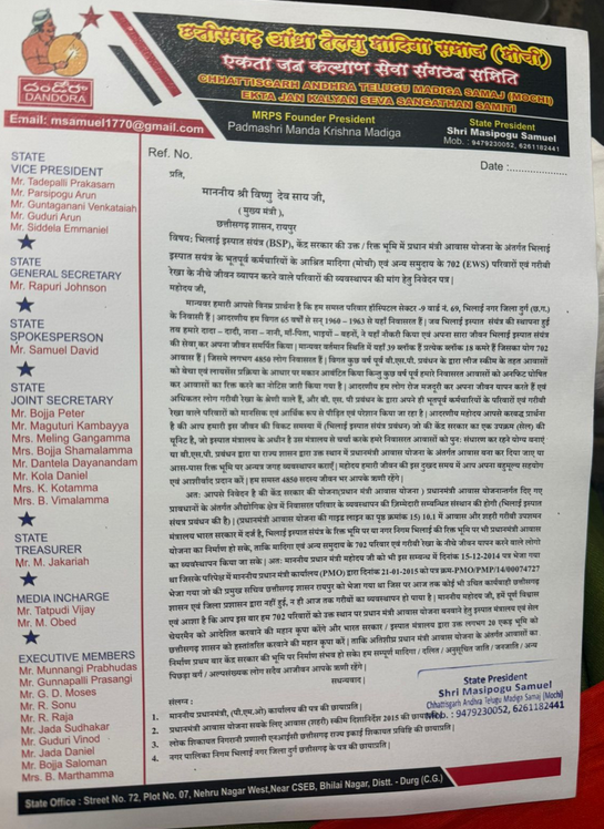 छत्तीसगढ़ आंध्र तेलुगु मादिगा समाज (मोची) ने मुख्यमंत्री छत्तीसगढ़, माननीय श्री विष्णु देव साय जी से इस विषय पर हस्तक्षेप की मांग की है, ताकि भिलाई इस्पात संयंत्र या राज्य शासन द्वारा संबंधित भूमि को प्रधानमंत्री आवास योजना के अंतर्गत संरक्षित कर 702 परिवारों का स्थायी व्यवस्थापन किया जा सके।