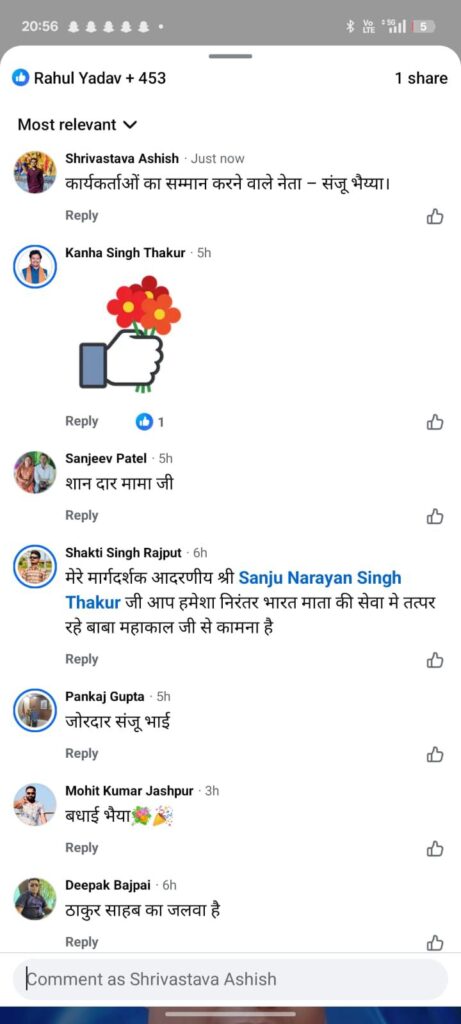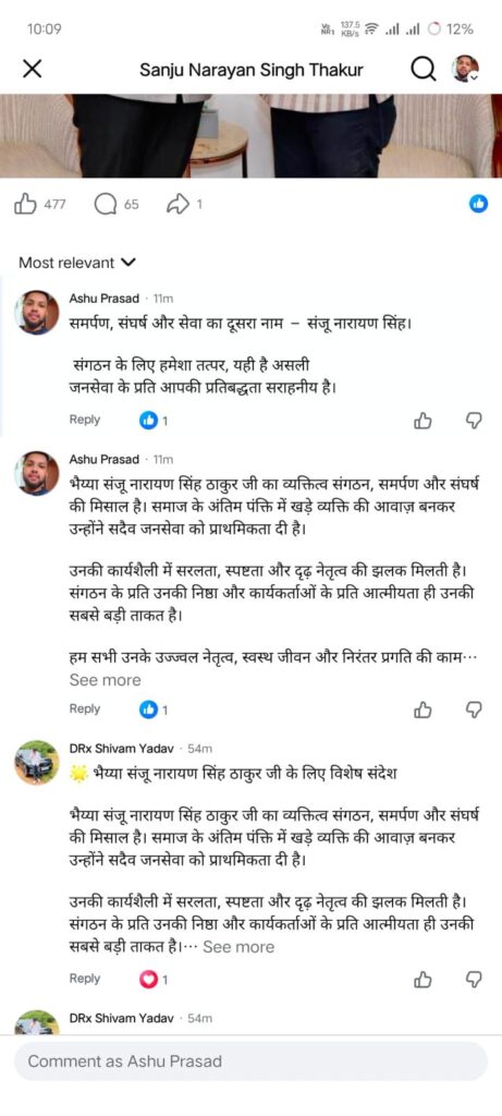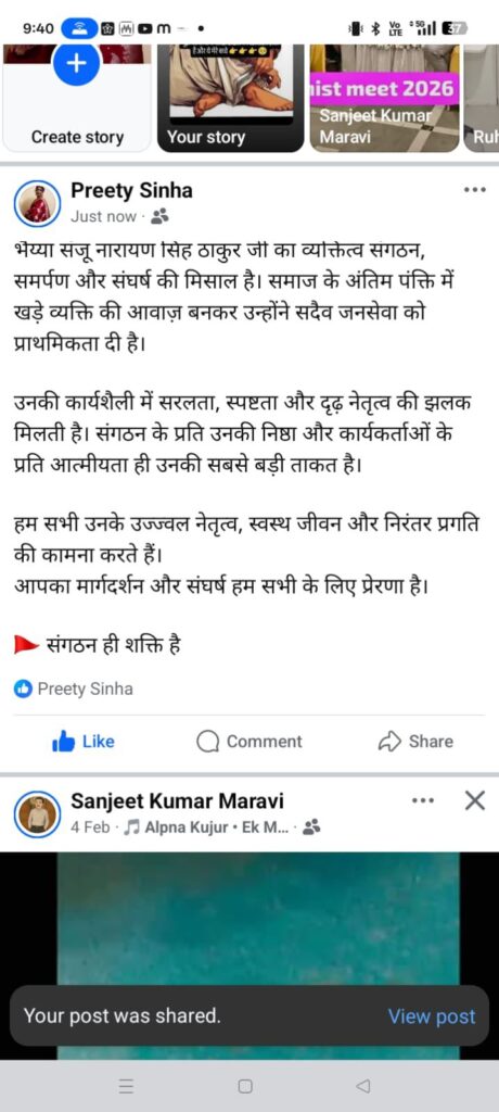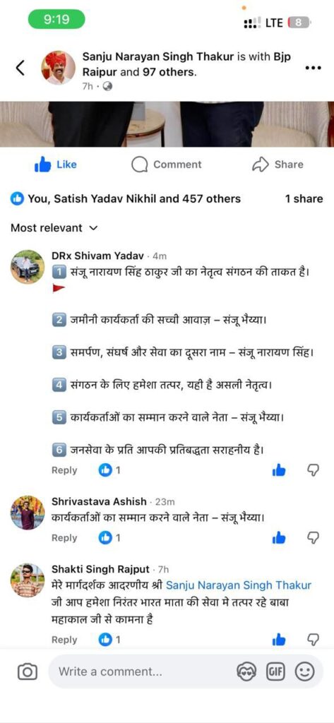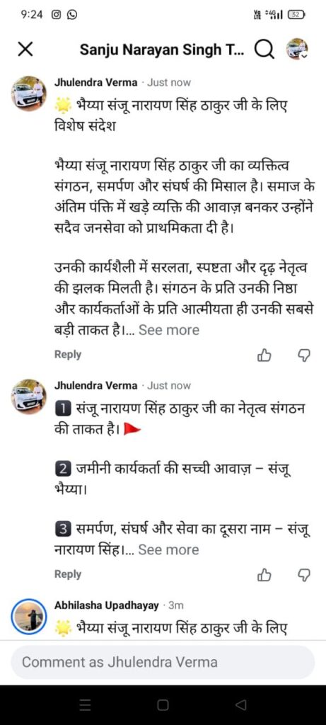 सोशल मीडिया पर उमड़ा यह जनसमर्थन स्पष्ट रूप से दर्शाता है कि संगठन के प्रति जनता का भरोसा लगातार मजबूत हो रहा है। भाजपा झुग्गी-झोपड़ी प्रकोष्ठ के संयोजक के रूप में संजू नारायण सिंह ठाकुर की सक्रियता और नेतृत्व क्षमता से संगठन का जनाधार निरंतर विस्तार पा रहा है। कार्यकर्ताओं ने इसे संगठनात्मक समन्वय और राष्ट्रीय नेतृत्व के साथ मजबूत संवाद का प्रतीक बताया है।